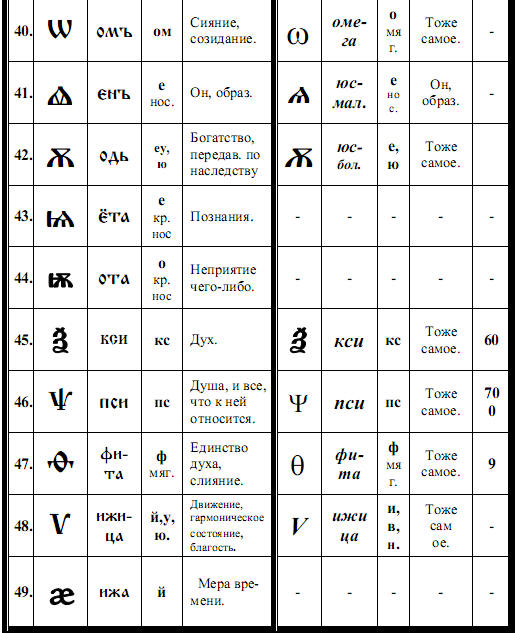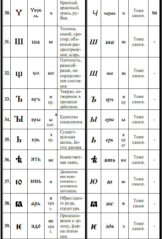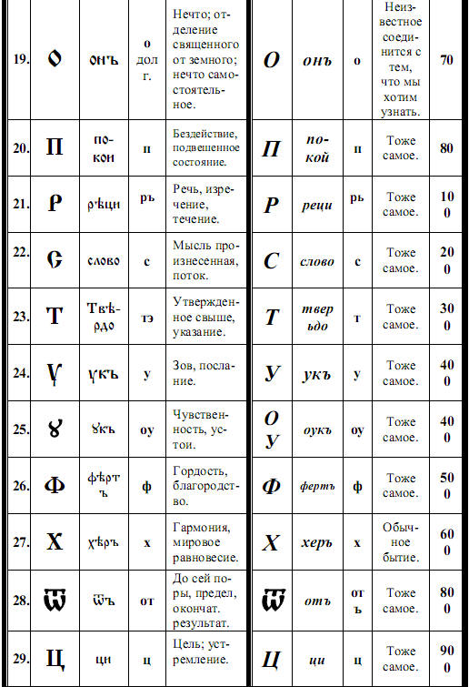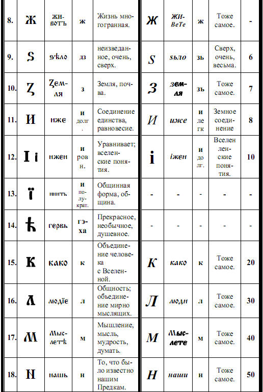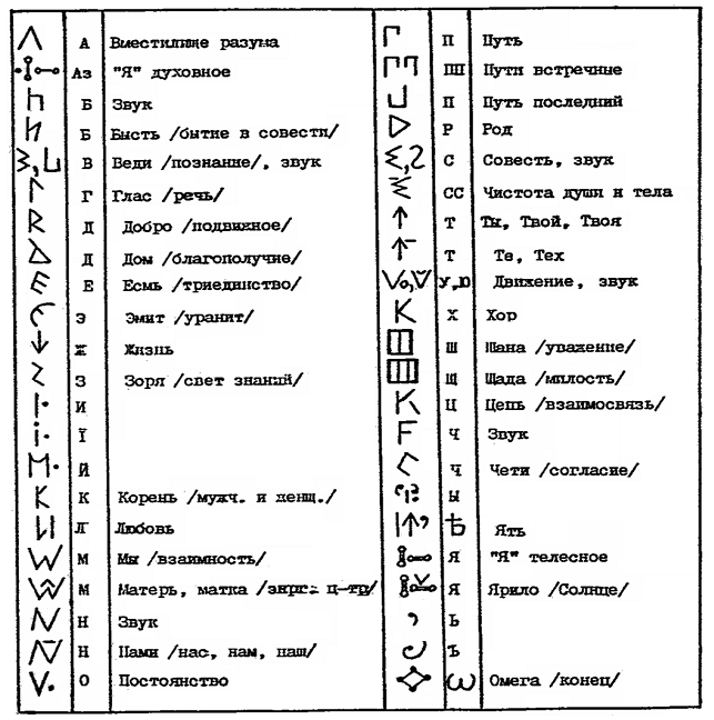 Этот отрывок с текстом «Патриарси» связывают не только имена. Если в одном источнике Дор (летописный Дир) назван варваром греческого происхождения, то в другом — полугреком, полуварваром. Летописи же неверно относят Дира, как и многих иных действующих лиц ранней русской истории, к варягам. Общность сведений обоих рунических памятников говорит о многом. Удревление исторической традиции, положенной в их основу до начала XIX века (дата сулакадзееской копии), делает саму мысль о фальсификации «Патриарси» смехотворной. Во времена Сулакадзева практически все сведения, содержащиеся в «Патриарси», были науке неизвестны. Христианские летописцы писали о славянах-язычниках примерно то же самое, что и сегодня: «...живяху зверским образом, живуше скотски, и убиваху друг друга, ядуще все нечистое, и брака у мн ж бываша...». Против подобных рассуждений выступал «коб». Авторы «Патриарси» так же вступались за честь славянского народа. На одной из ее дощечек читаем: «Аскольд — темный воин и только от греков просвещен, что никаких русов нет, а есть одни варвары. Этому можно только смеяться, так как киммерийцы были нашими предками, а они Рим потрясли и греков разгоняли как напуганных поросят». Ладожский документ заканчивается описанием страдающей Руси. О том же самом говорится и в «Патриарси»: «Русь сто крат разбита с севера до юга». Но в «Патриарси» мы находим продолжение мысли, оборвавшейся в документе на полуслове: «троекратно Русь падшая восстанет». Как актуально это древнее пророчество в наши дни! Державин показал пример успешного противостояния разрушению нашей памяти. До последних своих дней великий сын русского народа боролся за спасение русской руники и в конечном итоге победил. Чудом уцелевшие страницы открывают нам славянскую цивилизацию, не менее древнюю и не менее богатую, нежели цивилизация любого иного народа». Глава 2: Приближение к Буквице «Знаки - разные, язык - единый», - так написал П. Орешкин, заканчивая свою работу по расшифровке древних письменных памятников. Он предлагал специалистам по всемирной и русской истории: «дверь открыта, входите!». Но немногие услышали его. Остальные предпочли заткнуть уши и закрыть глаза, ибо «Свет для них губителен». Мы повторяем его призыв: «входите, люди добрые! Дверь открыта». Постижение образного наполнения нашего языка начнем, уподобившись школярам, с изучения двух форм написания букв и слов: древлесловенской (старословенской) «Буквицы» и древнерусской «Азбуки», т.е., как говорится, с самых азов. Но "АЗЪ" в образном понимании наших предков, ко всему прочему, есть «исток, начало (а) основы, системы (з) умения созидать, тварить (ъ)», а, ни нечто примитивное в современном искаженном восприятии. Каждая буквица (буква) в данной таблице несет свои образы, часть которых нами приведена здесь. Соединение образов буквиц в слове придает ему свой опреде- ленный смысл. Замена буквицы в слове, меняет и его смыслооб- раз, хотя фонетика слова может оставаться прежней. Приведем общеизвестный пример: до языковой реформы 1917 года название знаменитого произведения Л.Н.Толстого прописывалось так: «Война и МЇръ», т.е. «Война и Народ». Ныне: «Война и мир», т.е. «Война и не война», что, согласитесь, расходится с замыслом писателя. Это же слово с буквицей «ижица»: МVРо - благовонное масло (в конкретном случаи). Произношение: И - в 