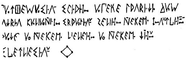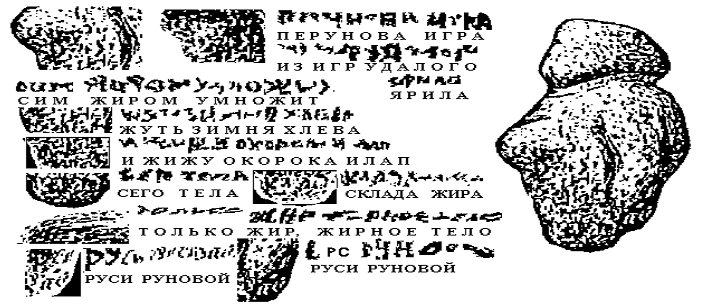 Глава 1: Виды письменности Задолго до христианизации Расичи («индоевропейцы» современной науки) имели множество видов письменности, о чем Екатерина II, приобщенная, как управительница империи, к тайной информации о прошлом, без обиняков заявляла, что славяне за многие тысячи лет до рождестваХристова свои письменности имели. Заметьте, не письмо, а письменности, т.е. различные виды письменной грамоты.Аналогичную точкузрениявыражали М.Ломоносов, В.Татищев, Е.Классен. Но подобных взглядов придерживались и придерживаются невсе,как онивыражаются, «языковые школы». В основном историческая наука всеми правдами и неправдами навязывает обществу мысль, что до христианизации славянорусы собственного письма не имели. Ныне признаются лишь «черты и резы», да и то под напором многочисленных находок образцов этого словенского народного письма. Все остальное - отвергается, с ходу объявляясь «подделкой, фальшивкой, националистическим бредом». Не будем ввязываться в безплодную дискуссию о миссии «солунских братьев», т.к. оценку их деятельности дал в свое время известный историк Н.И.Костомаров. Для нас важнее то, что РПЦ изначально знала о том, что у славян есть своя собственная письменность (в церковно-историческом словаре за 1889 г. четко говорится по этому поводу: «Россы, варяжское племя, жили в южной России; с Византией то вели дела торговые, то воевали. От них заимствовал буквы Св. Кирилл».), но предпочитала особо не афишировать свои знания. Это политика, которая во все времена считалась нечистым видом деятельности. Именно она виной тому, что самому большому по численности этносу Европы уже какое столетие отказывают в самобытности: кто и как угодно, но только не славяне (особенно восточные). Не здесь ли, как говорится, собака зарыта? Подобный психологический (магический) прием наши предки называли «отводом глаз», т.е. переключением внимания на что-то, не соответствующее реальной действительности. «Они (греки) говорили, что установили нам письменность, чтобы мы приняли ее и утратили свою. Но вспомните о том Иларе (Кирилле), который хотел учить детей наших и должен был прятаться в домах наших, чтобы мы не знали, что он учит наши письмена, и то, как Богам нашим требы класть» (Влескнига /Патриарси). Существует каталог части рунических рукописей из библиотеки Анны Ярославны, которые после долгих перипетий оказались у известного коллекционера 19 века, ученого-археографа А.И. Су- лакадзева. В этом каталоге упоминаются два извода «Книги Велеса»: Ягилы Гана смерда из Ладоги («Патриарси») и Олеха Вишерца из Чердыни («Криница») - «о переселениях старожилыхъ людей и первой вере». Были в нем и «Колядникъ 5 века дунайца Яловца о поклонениях Тройскимъ горамъ, о гаданиях в печерахъ», «Волховникъ» рукопись 6 века, «Путник» 4 века, «Перуна и Велеса вещания в киевских капищах жрецам Мовеславу, Древославу и прочим» (5,6 века) и т.д. Арабы также говорили о наличии самобытного письма на Руси (ибн Фадлан, аль Масуди, ибн Якуб эль Недим). Немецкий хронист, епископ Мерзебургский Титмар видел в одном из славянских храмов г. Ретры, что на острове Ругин (Рюген), несколько куммиров, на которых знаками были начертаныих имена.Писатель Иванченко в книге «Путями великого россиянина» приводит древнюю азбуку росичей 2 тысячелетия до н.э. и накаменную надпись из Приазовья, взятую им из книги Ф. 